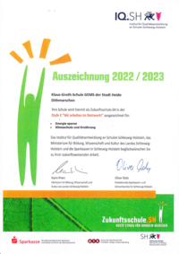 Weil die Aktivitäten organisatorisch in den Schulalltag eingebunden sind und die KGS sich auch im Netzwerk „Plietsch fürs Klima“ engagiert und mit anderen Institutionen kooperiert, wurde sie erneut für die Jahre 2022/2023 als Zukunftsschule SH in der Stufe 2 „Wir arbeiten im Netzwerk“ ausgezeichnet.