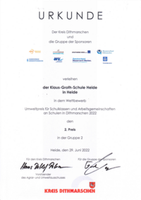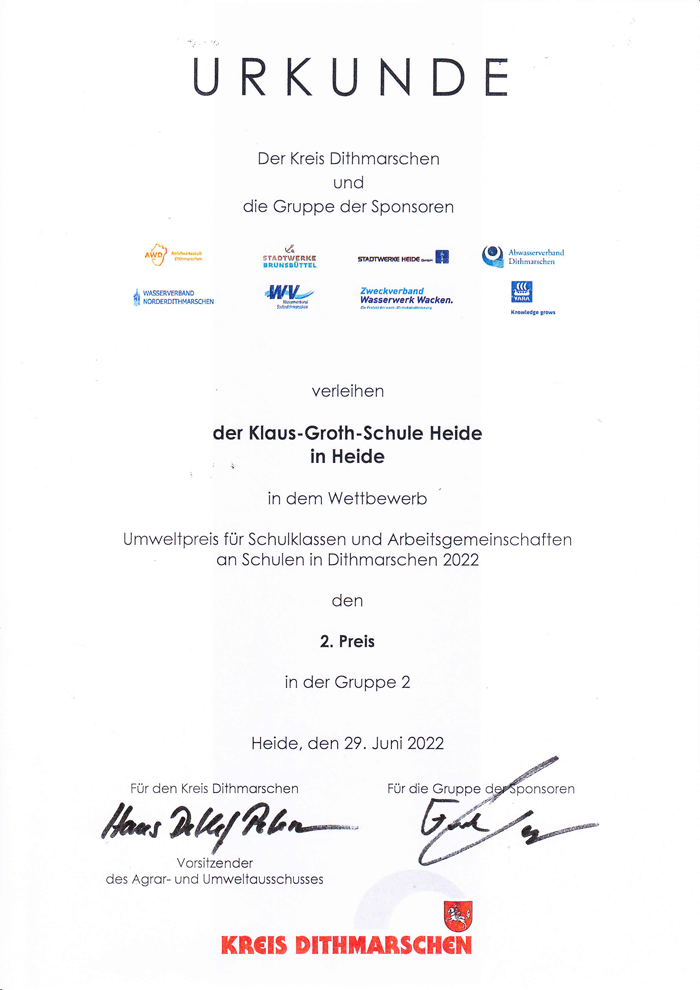Bei der diesjährigen Verleihung des Umweltpreises des Kreises Dithmarschen erhielt die Grundschule einen Sonderpreis. Die 5. - 10. Klassen wurden mit dem 2. Preis für ihren kontinuierlichen Einsatz für die Umwelt ausgezeichnet.