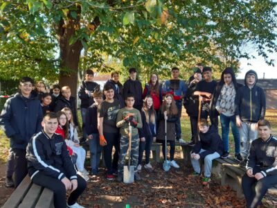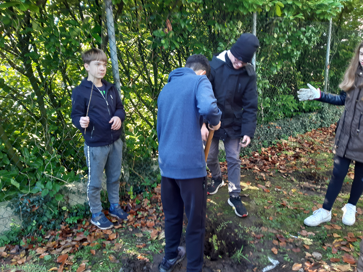 Einen halben Vormittag gruben, pflanzten und bewässerten die Siebtklässler/-innen. Nachdem sie das Pflanzgelände zudem mit Absperrband gegen unbefugten Zutritt gesichert hatten, betrachten die Mädchen und Jungen stolz ihr Werk. Mehrere von ihnen stellten fest: „Das ist erst der Anfang. Nächstes Jahr machen wir weiter.“ Auch aus anderen Klassen erfolgte Zuspruch und der Wunsch, im nächsten Jahr Teil des Projekts zu werden.