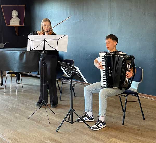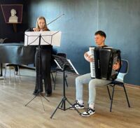 Die Aula der Klaus-Groth-Schule füllte sich am vergangenen Dienstag (28.02.2023) bis auf den letzten Platz. 70 interessierte Schüler der Jahrgangsstufen 7 bis 9 warteten gespannt auf für sie eher ungewohnte Klänge: Wiktoria Francuz mit der Violine und Oleksandr Semko mit dem Akkordeon von der staatlich geförderten Warschauer Musikschule zeigten ihr außergewöhnliches Können als Solisten und als Duo u.a. mit Werken von J.S. Bach, J. Brahms und Henryk Wieniawski.