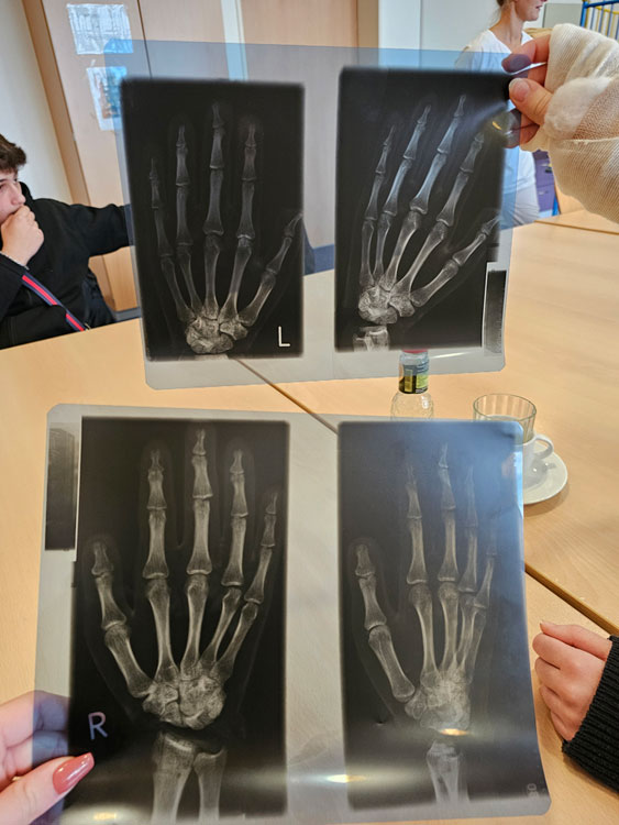 Für eine weitere Gruppe hat sich das Westküstenklinikum Heide ein vielseitiges Programm einfallen lassen, um einen Einblick in die Berufszweige geben zu können. In der Ausbildung zum Krankenpfleger lernen die Auszubildenden schon zu Beginn, wie sie bei den Patienten korrekt Puls und Blutdruck messen. Aus diesem Grund stand das Messen dieser Werte für die Schülerinnen und Schüler auf dem ersten Programmpunkt und sie hatten direkt die Möglichkeit, diese Werte untereinander messen zu können. Im Anschluss daran fand direkt eine korrekte Desinfektion der Hände statt. Hierfür wurden die Hände mit einer Rote-Bete-Lösung eingerieben, um genau sehen zu können, welche Bereiche der Hände nicht gründlich genug behandelt wurden. Neben einem Pflaster - und Verbandswechsel wurde innerhalb der praktischen Phase auch eine Infusion mit einer Kochsalzlösung vorbereitet und die richtige Dokumentation besprochen. Zwischen den einzelnen praktischen Übungen wurde den Schülerinnen und Schülern Wissenswertes einzelner Ausbildungen und verschiedene Perspektiven von einzelnen Auszubildenden des WKKs nähergebracht. Um den Tag abzurunden, gab es am Ende des Tages noch einen interessanten Rundgang durch die Radiologie